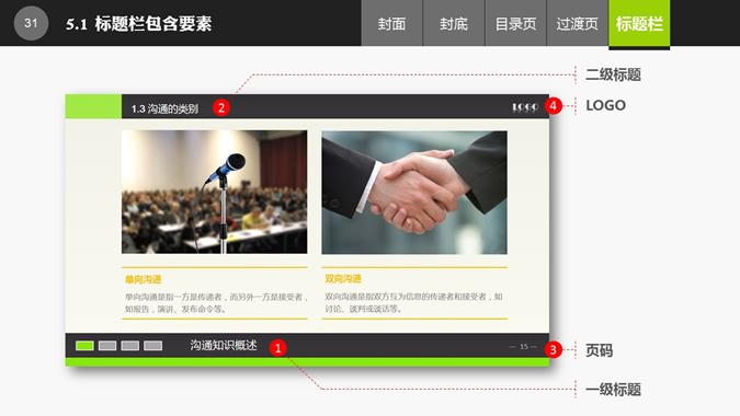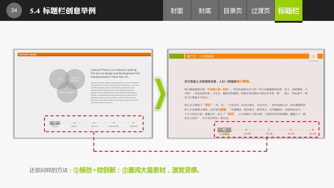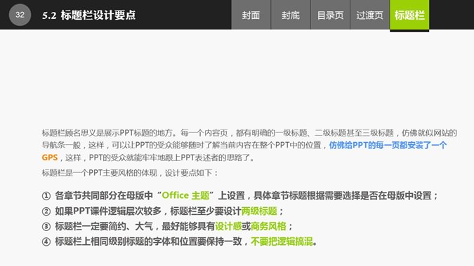 布衣公子的PPT整体设计教程,共35页,内容丰富,讲解细致,介绍了封面、封底、目录页、过渡页、标题栏的设计经验。
