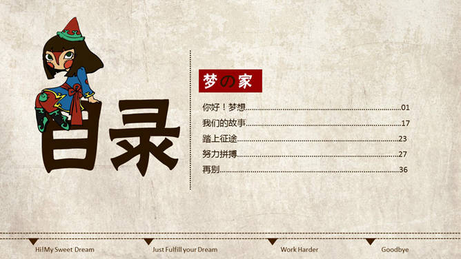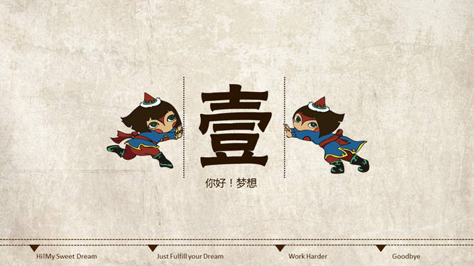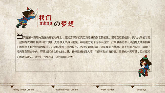 一份关于梦想的卡通幻灯片模板,设计的很有艺术范,动态播放效果,建议安装字体: