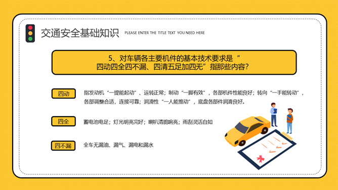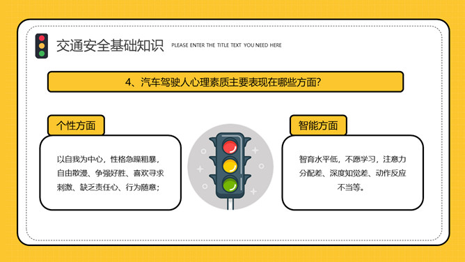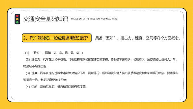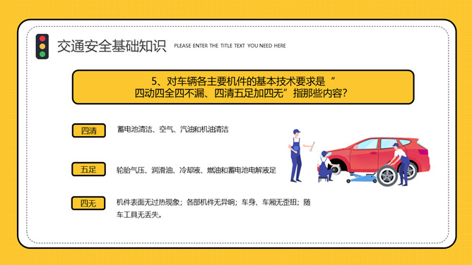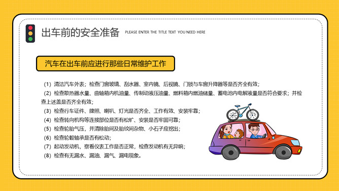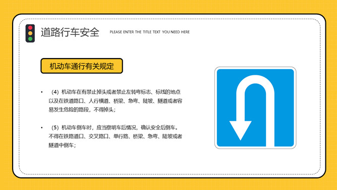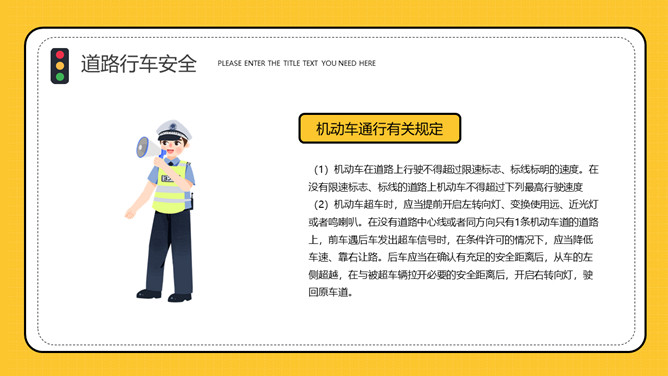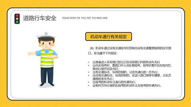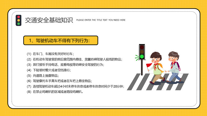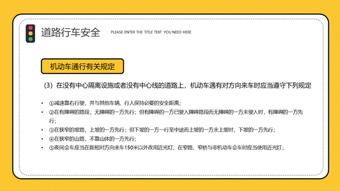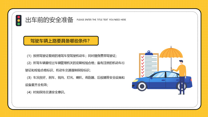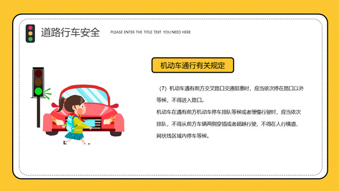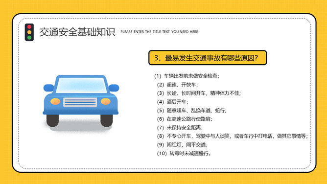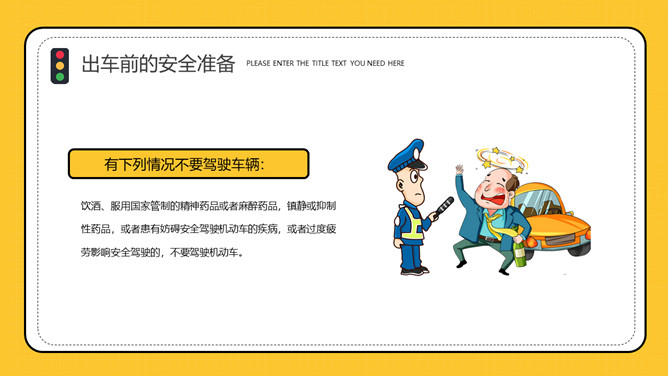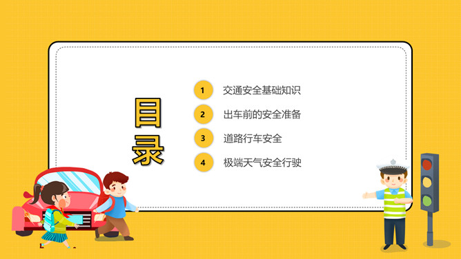 道路交通安全教育PPT模板。一套全国交通安全日道路安全教育模板,包括交通安全基础知识、出车前的安全准备、道路行车安全、极端天气安全行驶等内容。