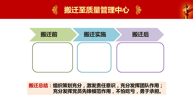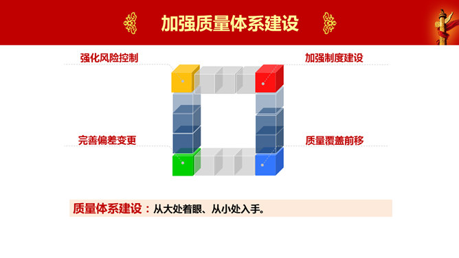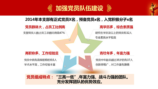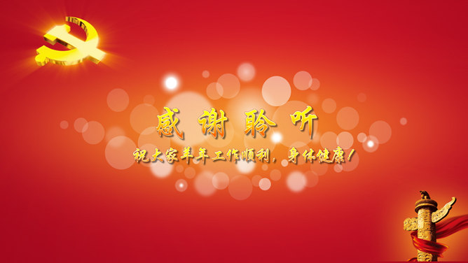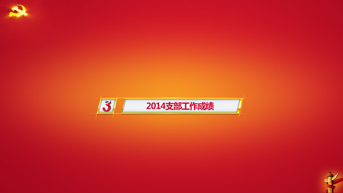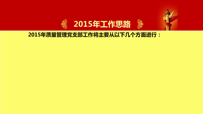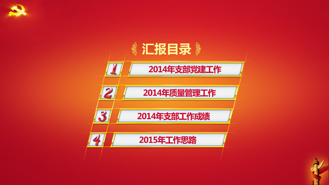 一份党建年终工作总结PPT模板,红色主色调,党徽、华表为主要背景元素,包括工作内容、工作成绩和来年的工作思路。