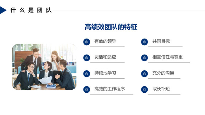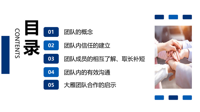 团队精神团队培训PPT模板。内容包括团队的概念、团队内信任的建立、团队成员的相互了解取长补短、团队内的有效沟通、大雁团队合作的启示。