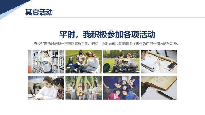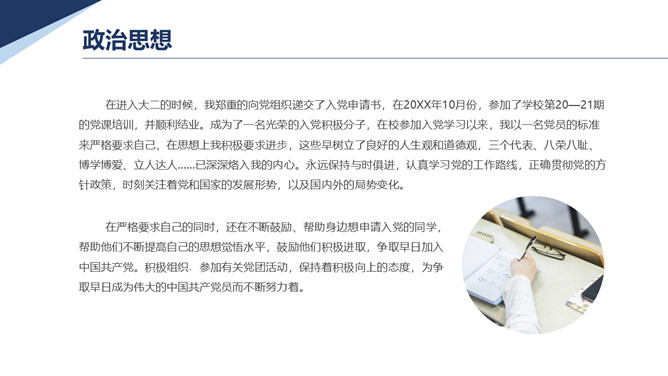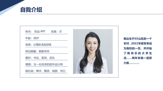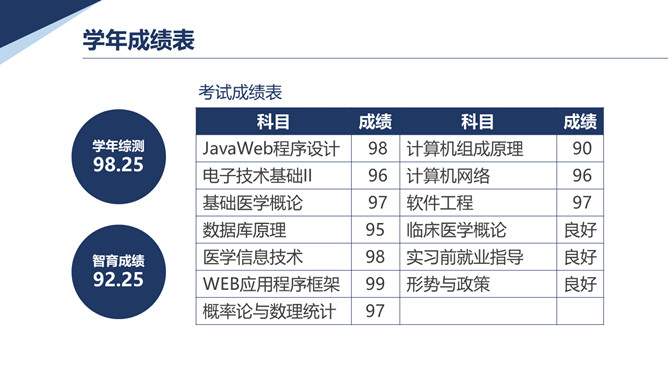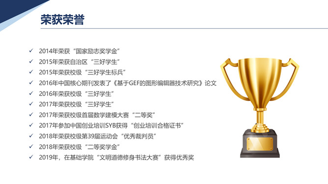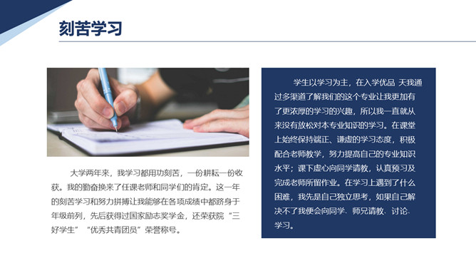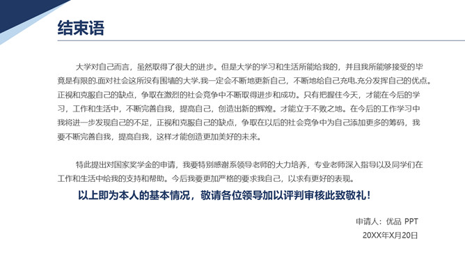 国家奖学金答辩PPT模板。一套申请国家奖学金答辩幻灯片模板,包括自我介绍、刻苦学习经历、学年成绩表、获得的荣誉和证书、思想政治等内容。