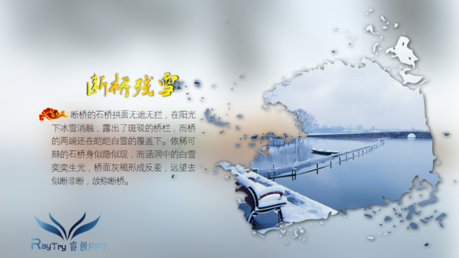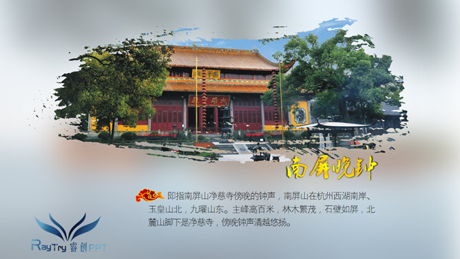 一份介绍西湖十大旅游景点的PPT,哪十大景点?苏堤春晓、曲院风荷、平湖秋月、断桥残雪、柳浪闻莺、花港观鱼等。