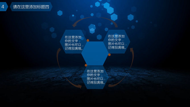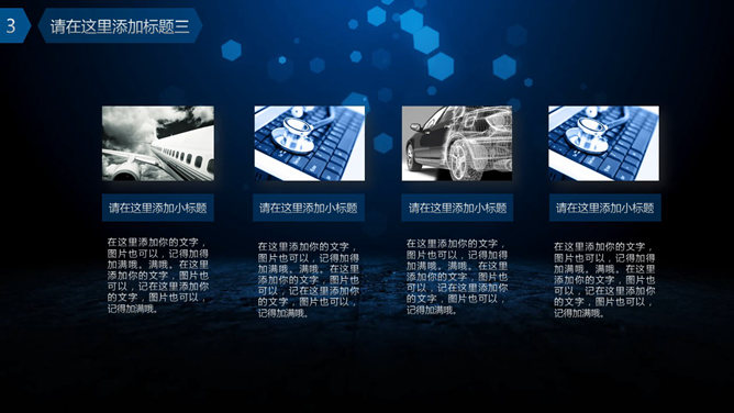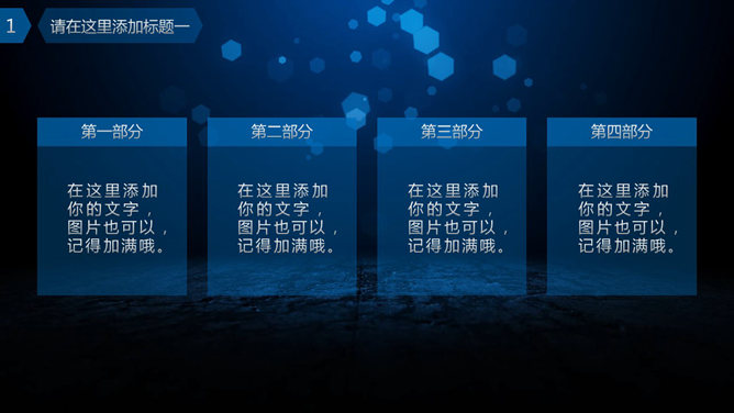 一份深蓝色主色调的通用幻灯片模板,以动态光斑为背景,很有视觉效果,设计简洁,通用性强,能胜任多种主题。
