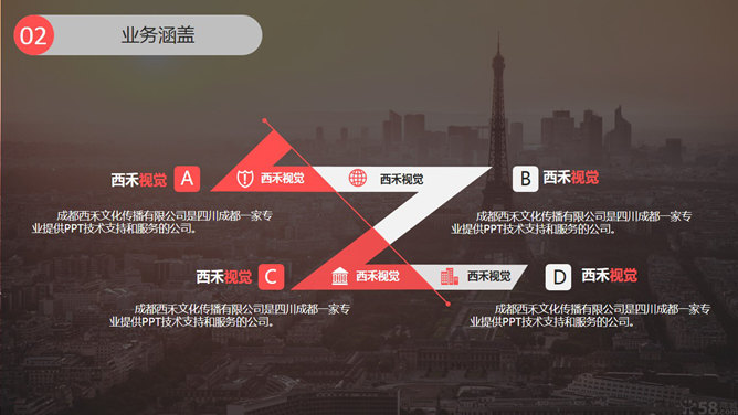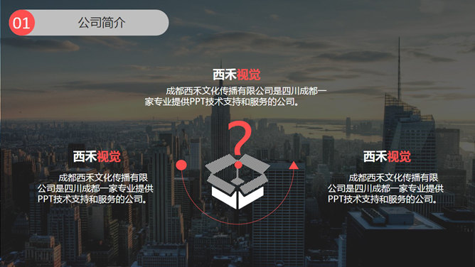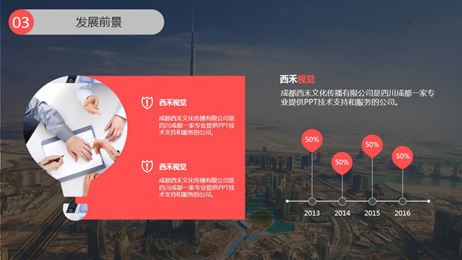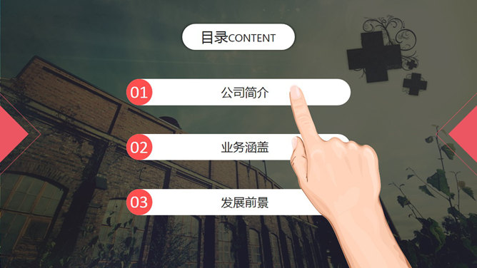 一份高大上公司介绍PPT模板,创意动态手势手触效果,LOMO风格全景图片背景,包括公司简介、业务涵盖、发展前景。