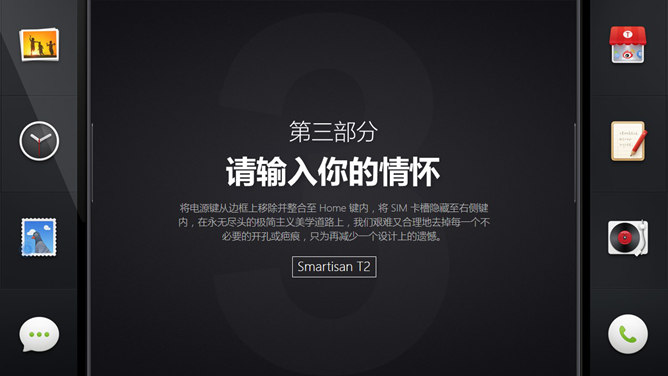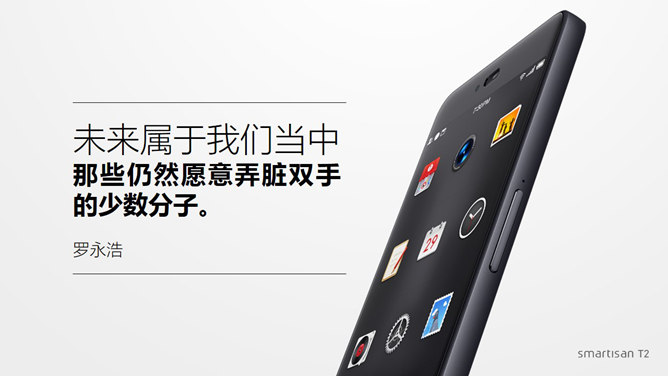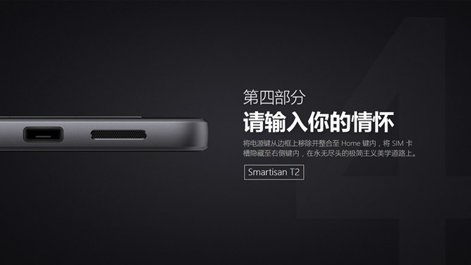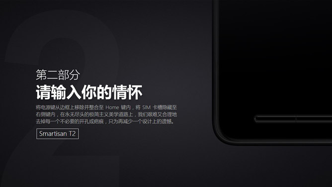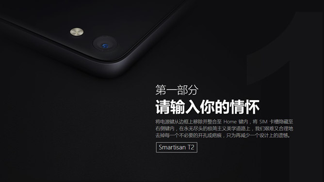 @Simon_阿文关于锤子手机T2(Smartisan T2)宣传介绍的PPT作品,深得锤子手机官方网站设计风格的精髓。一个有情怀的PPT设计师制作的关于一个有情怀的产品人设计的一个有情怀的产品的宣传推介PPT作品。
