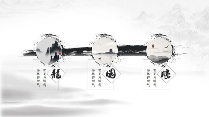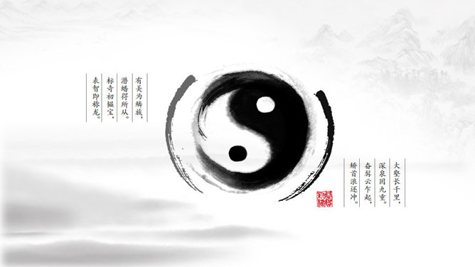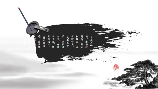 ,墨水入水流动效果设计的龙凤图案,配合毛笔字体、印章等古典元素,很有设计感,动态翻书效果切换,难得的一份中国风幻灯片模板佳作。注意安装字体: