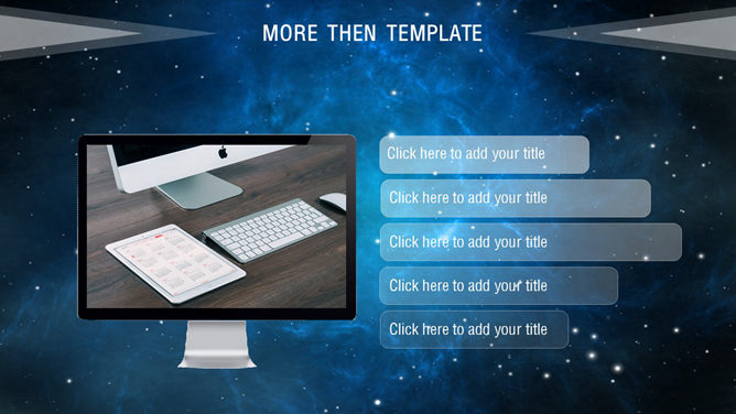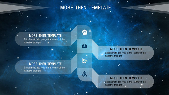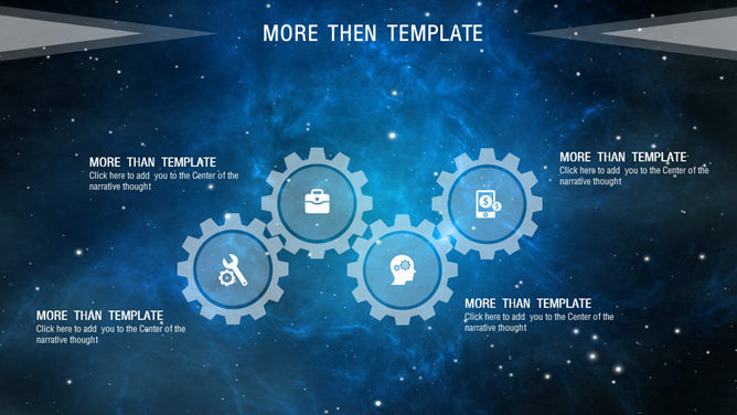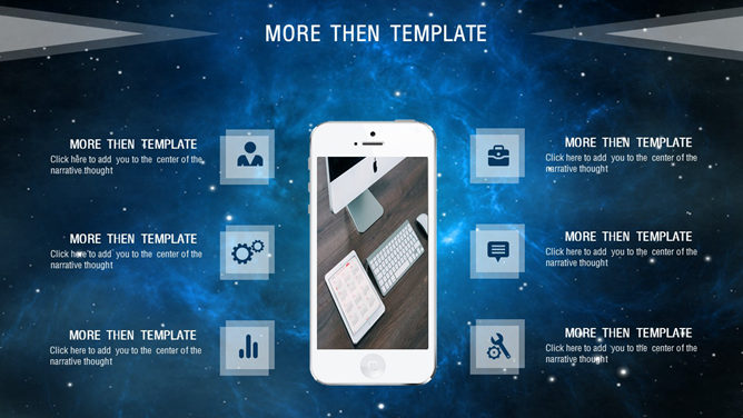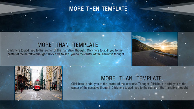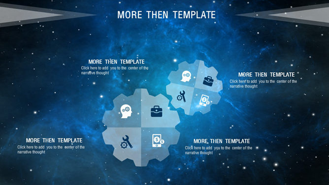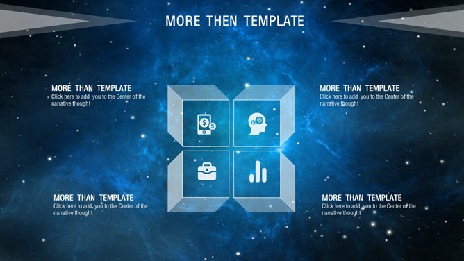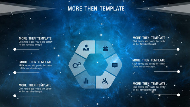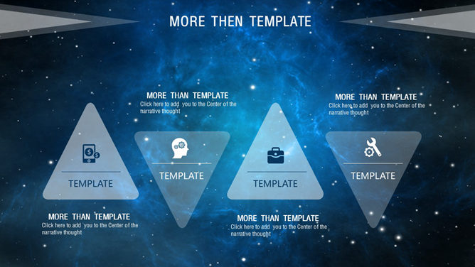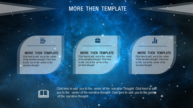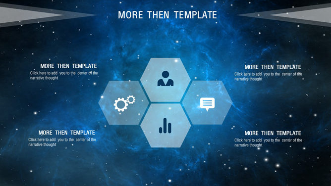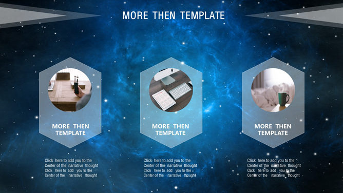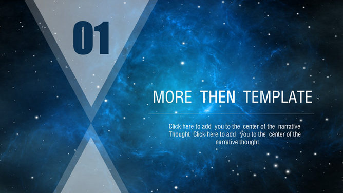 精美华丽宇宙星空PPT模板。一份好看的多用途通用幻灯片模板,以蓝色神秘的宇宙星空为背景,半透明形状元素设计,共23页,页面类型丰富,很有视觉冲击力。