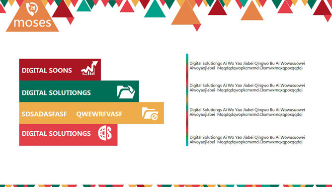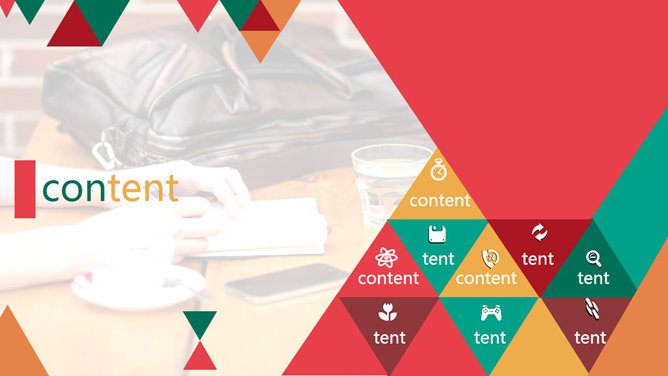 活力时尚彩色三角形PPT模板。一份色彩绚丽的通用幻灯片模板,以五颜六色的小三角形装饰,配色布局年轻时尚有活力。
