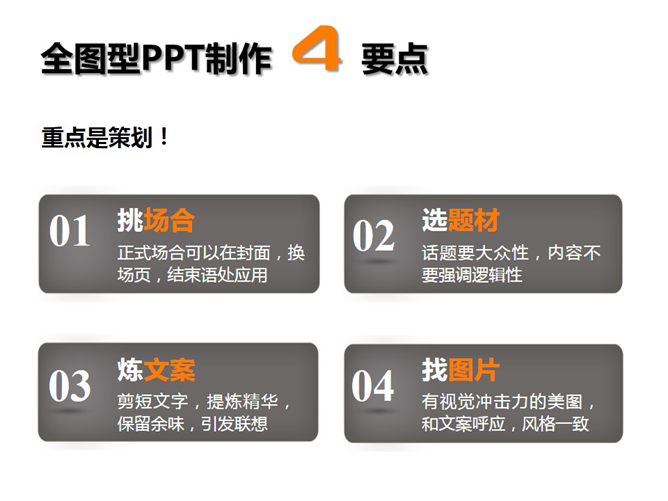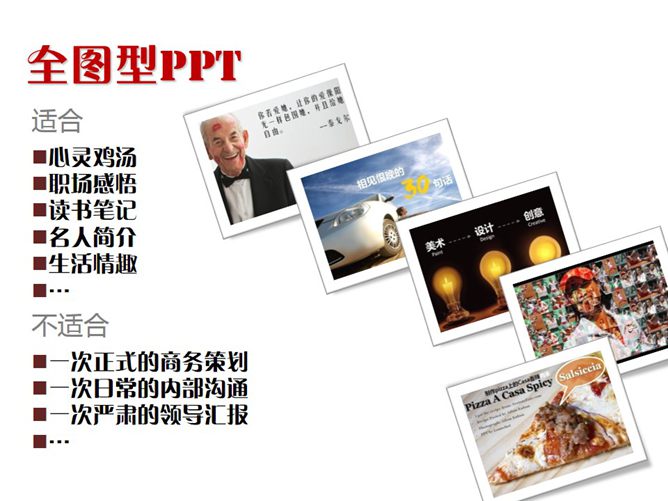 全图型PPT设计方法技巧教程。这份教程告诉你如何设计全图型PPT。全图型PPT的优点在于视觉表现力强、情景故事感强、文字观点突出,缺点是文字排版困难、适合场合有限、图片质量苛刻。四个要点:1、正式场合可以在封面,换场页,结束语处应用。2、话题要大众性,内容不要强调逻辑性。3、简短文字,提炼精华,保留余味,引发联想。4、有视觉冲击力的美图,和文案呼应,风格一致。