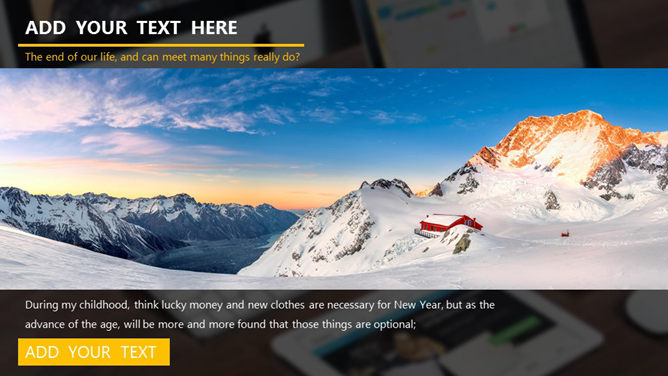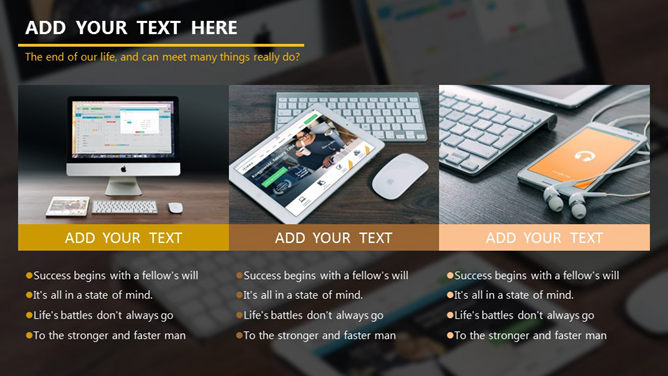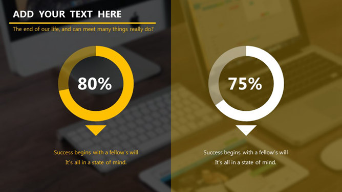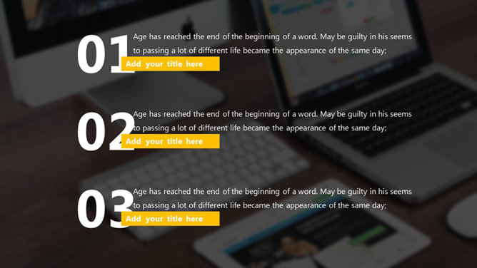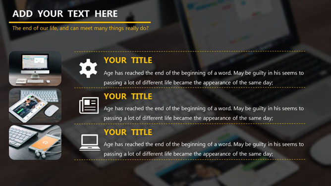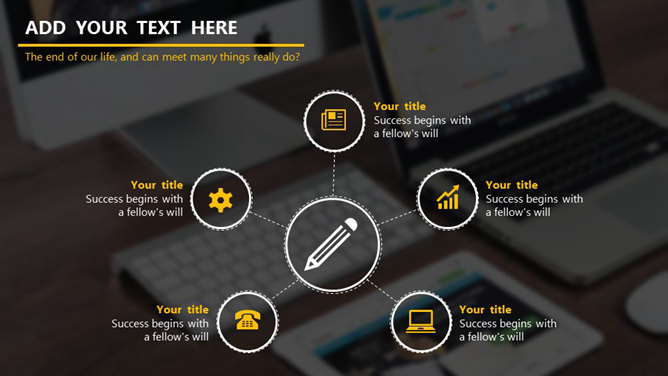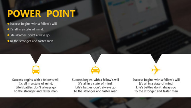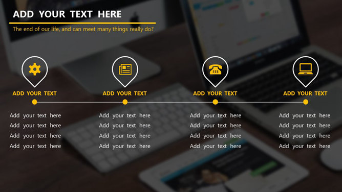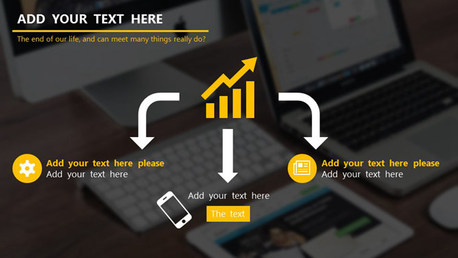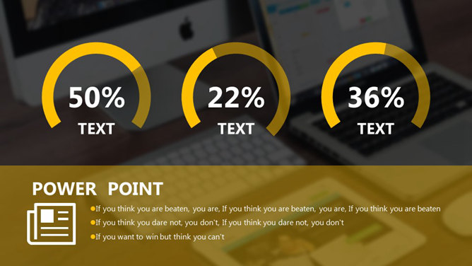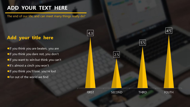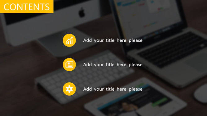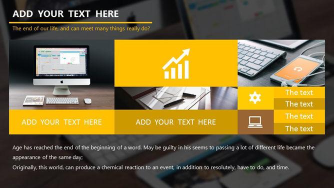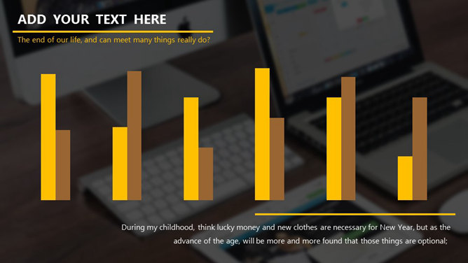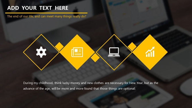 高大上电脑桌面背景PPT模板。一份很有逼格的高大上商务幻灯片模板,以虚化电脑桌面为背景,黑黄配色,时尚大气。