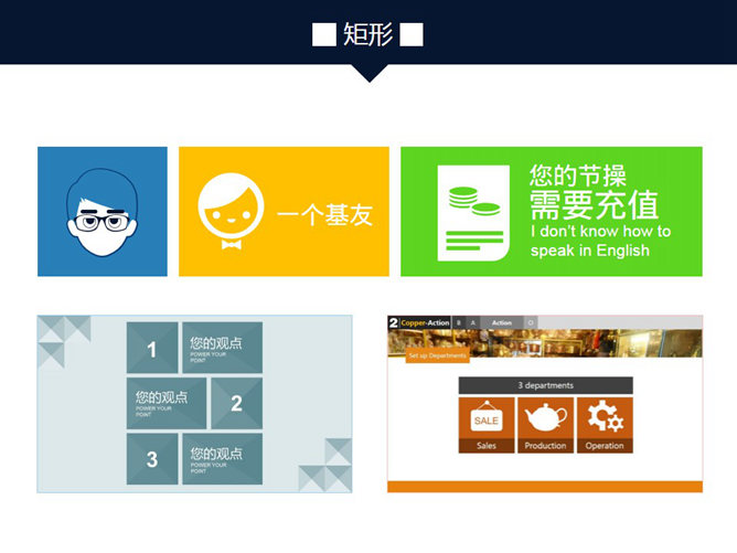 嘉文钱扁平化PPT设计教程色块篇。扁平化PPT风格的核心之一是色块。注意四原则:去高光、去渐变、去阴影、去三维。注意留空:字体内容与色块边框的安全距离为字宽的四分之一,小鱼这个距离就会让人感觉很挤。