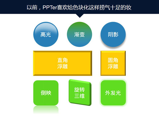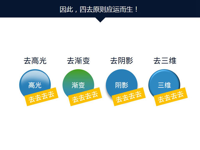 嘉文钱扁平化PPT设计教程色块篇。扁平化PPT风格的核心之一是色块。注意四原则:去高光、去渐变、去阴影、去三维。注意留空:字体内容与色块边框的安全距离为字宽的四分之一,小鱼这个距离就会让人感觉很挤。