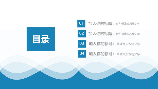 简约蓝色波纹月度工作总结PPT模板。一套月工作总结汇报模板,清新蓝色色调,波浪波纹背景,极简设计风格。