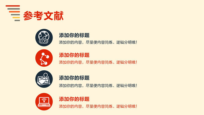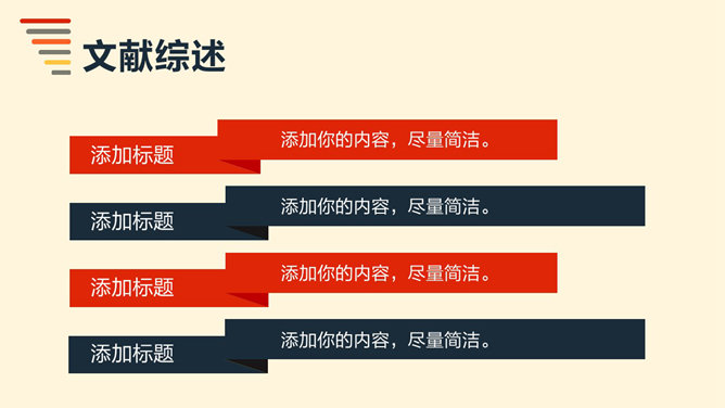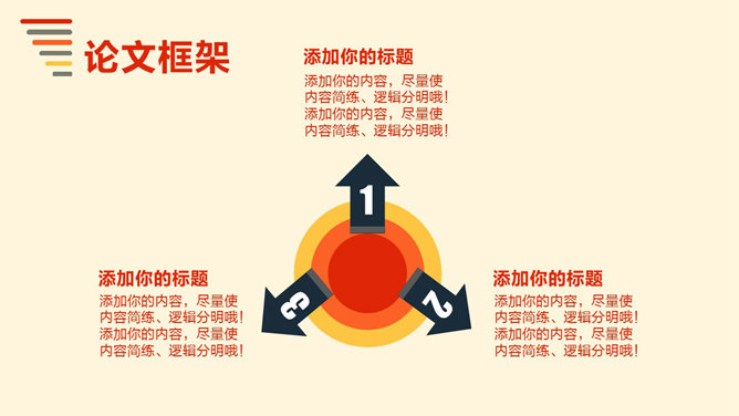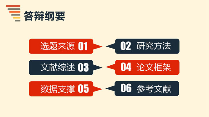 简洁暖色毕业论文答辩PPT模板。一份简洁实用的毕业论文答辩幻灯片模板,采用红橙黄暖色系配色,包括选题来源、研究方法、文献综述、论文框架、数据支撑、参考文献等页面。建议安装字体:方正兰亭粗黑简体、方正兰亭黑简体、Impact。