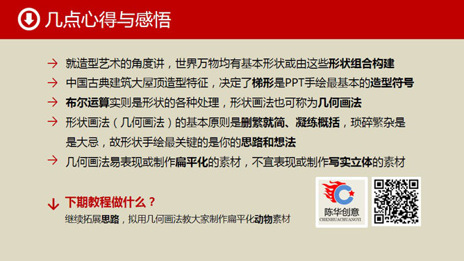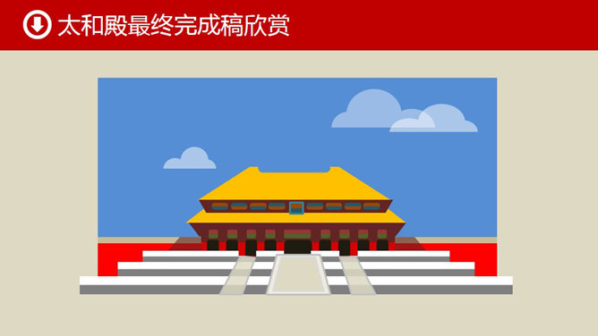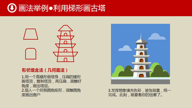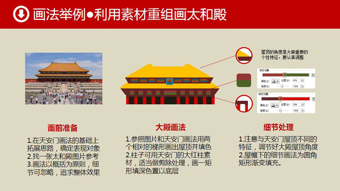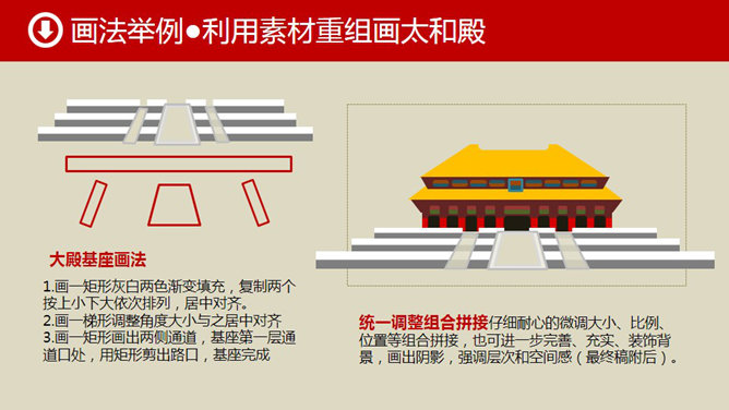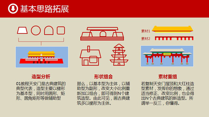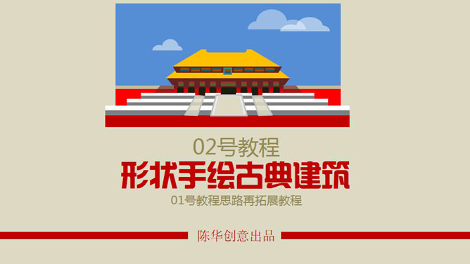 形状手绘古典建筑PPT教程,01号教程思路再拓展教程。造型分析:01教程天安门是古典建筑的典型代表,造型主要以梯形为基本型,同时用圆形、矩形、圆角矩形等做辅助型。形状组合:以基本型为主体,以辅助型为副形,改变大小比例重新加以组合,即可得到N个建筑造型。由此可见,画古典建筑多以梯形为主体。素材组合:若复制天安门屋顶和大红柱造型素材,发挥你的想象,通过适当修正、改变比例,也会得出N个古典建筑的新造型。所谓举一反三,你懂得。