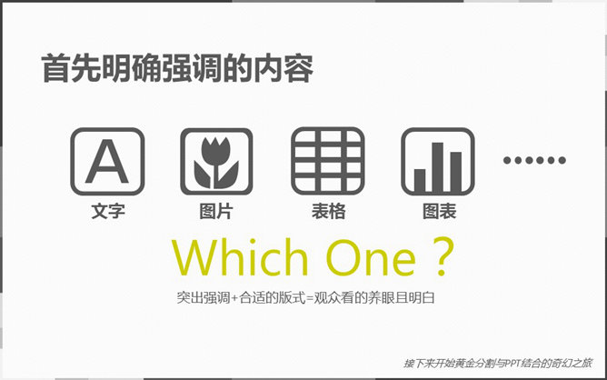 黄金分割在PPT设计中的运用。黄金分割对PPT设计有重要的借鉴意义,无论是模板、自由版式、图片、文字,还是表格等都可以从中受益很多。在设计PPT时,黄金比例有一个允许变化的幅度,刻意去追求完美的黄金分割,反而可能弄巧成拙。我们只要记住两点就够了:1.突出强调;2.看起来舒服。做到这两点,其实已经无意中运用了黄金分割。
