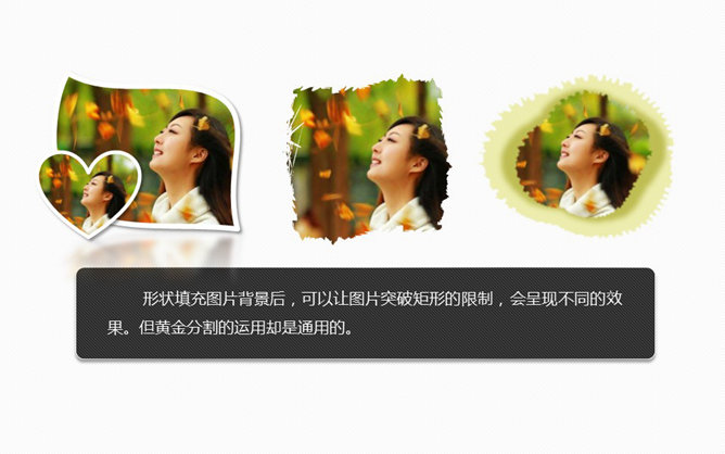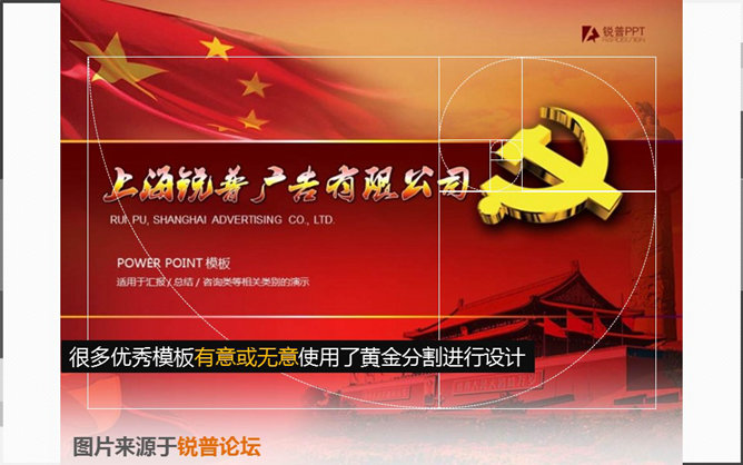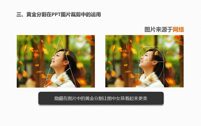黄金分割在PPT设计中的运用。黄金分割对PPT设计有重要的借鉴意义,无论是模板、自由版式、图片、文字,还是表格等都可以从中受益很多。在设计PPT时,黄金比例有一个允许变化的幅度,刻意去追求完美的黄金分割,反而可能弄巧成拙。我们只要记住两点就够了:1.突出强调;2.看起来舒服。做到这两点,其实已经无意中运用了黄金分割。