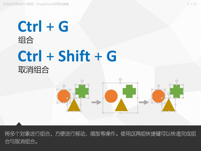 PowerPoint快捷键使用技巧。Ctrl + D快速复制对象,替代Ctrl+C和Ctrl+V的组合键,完成快速复制,将对象瞬间复制多个变得易如反掌,同时还能实现快速排版效果哟。Ctrl + G组合,Ctrl + Shift + G取消组合,将多个对象进行组合,方便进行移动、缩放等操作。使用这两组快捷键可以快速完成组合与取消组合。Ctrl + Alt + V选择性粘贴,快速打开“选择性粘贴”对话框,可以根据需要选择对象粘贴格式,这里面我常用的是“图片(PNG)”和“无格式文本”。Ctrl + Shift + C复制对象格式,Ctrl + Shift + V粘贴对象格式,快捷键复制和粘贴对象格式,可以快速完成格式的重复设置,特别是将格式粘贴给组合中的对象时,非常方便。Shift + F9显示/隐藏网格线,Alt + F9显示/隐藏参考线。Ctrl +鼠标滚轮,快速缩放。