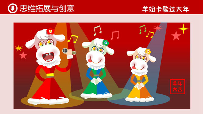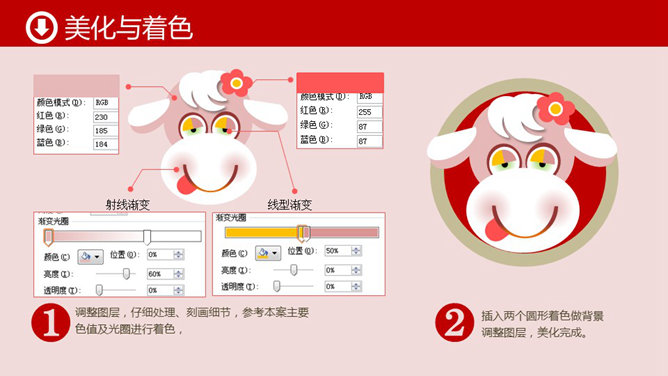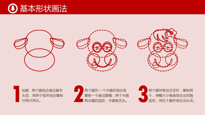 手绘动物PPT教程(羊)。基本形状画法:1、两个圆组合画出基本头型,用两个弧形组合复制做两个耳朵。2、两个圆形,一个半圆形组合再复制一个画出眼睛;两个半圆剪出嘴的造型,半圆做舌头。3、两个圆形剪出月牙形,复制两个,调整大小角度组合出刘海造型;用五个圆形组合出头花。美化与着色:1、调整图层,仔细处理、刻画细节,参考本例色值和光圈进行着色。2、插入两个圆形着色做背景调整图层,美化完成。