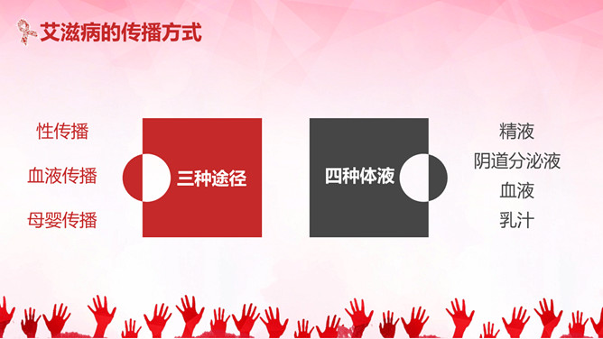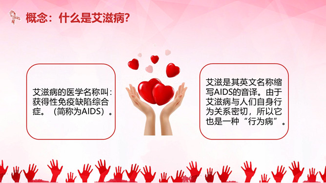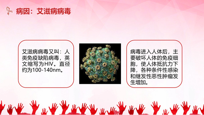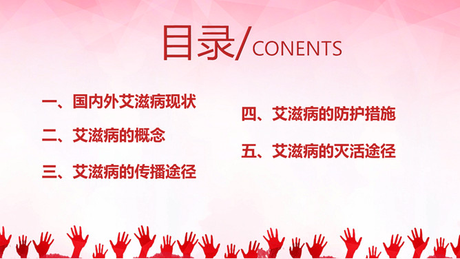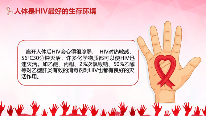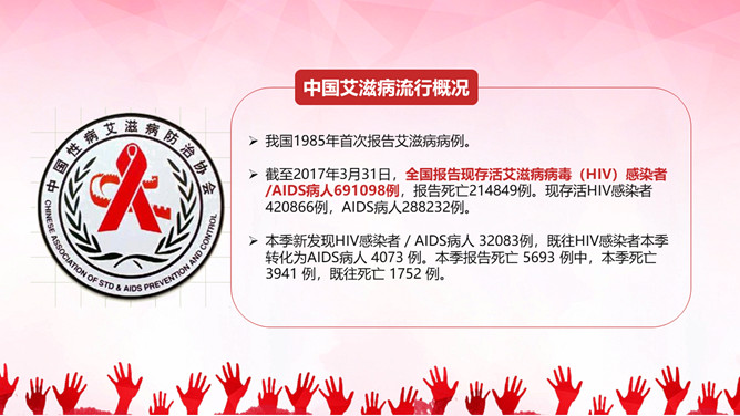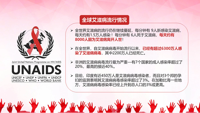 珍惜生命预防艾滋病PPT模板。内容包括国内外艾滋病现状、艾滋病的概念、艾滋病的传播途径、防护措施和灭活途径。