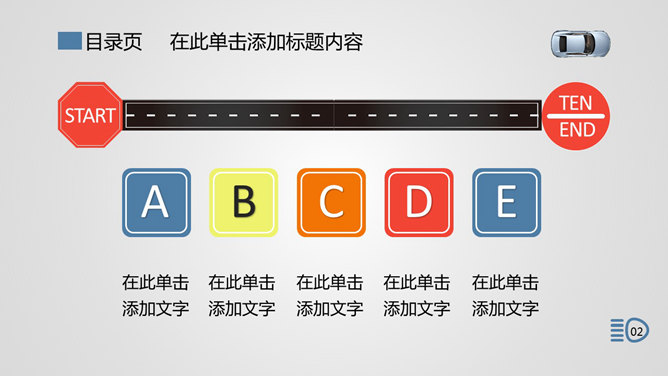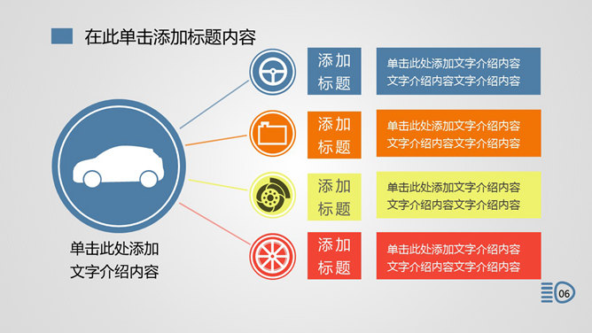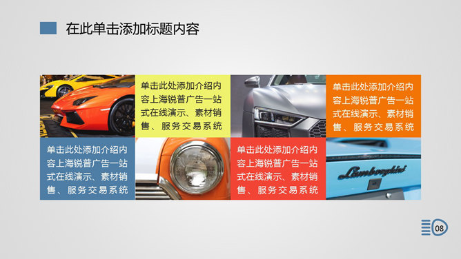 汽车行业产品宣传PPT模板。一份适合汽车相关行业从业人员使用的幻灯片模板,以艺术汽车图片及小图标元素设计。