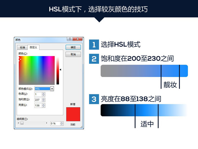 嘉文钱扁平化PPT教程颜色篇上。壹文钱系列教程是对《PPT扁平化风格设计手册》的全面补充。首先,了解一下什么是色相,色相相当于颜色的名字,饱和度相当于女人化妆的浓度,亮度就是颜色的肤色。颜色的RGB值:用红、绿、蓝三种颜色来决定一种颜色,范围为0到255。选色的原则是鲜艳而不刺眼。HSL模式下,选择教灰的颜色,可以避免颜色刺眼。