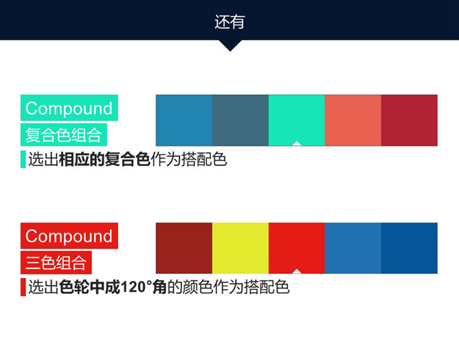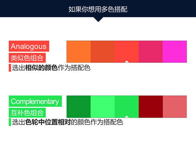 嘉文钱扁平化PPT教程颜色篇下。很多配色教程都提到了Adobe Kuler这个配色工具,kuler.adobe.com选好一种颜色后,根据不用的模式会自动生成对应的颜色搭配,非常方便。真正好高手是平时练功,如果你觉得上述方式麻烦,那么Nordri Tools这个超强插件你绝对会喜欢。善用黑白色半透明会让你的PPT更专业。只要控制好比例互补色搭配也不可怕。