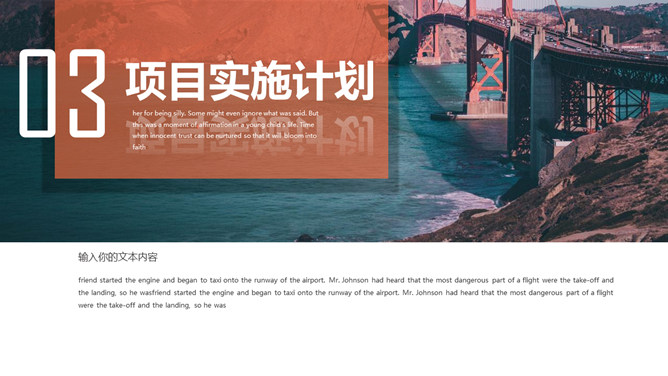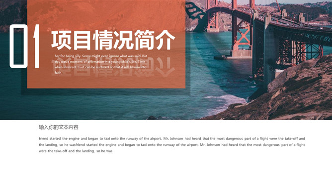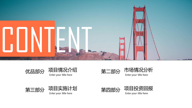 大气商务项目提案PPT模板。一套商务项目提案模板,大气宏伟大桥背景,橙色主色调,动态播放效果。
