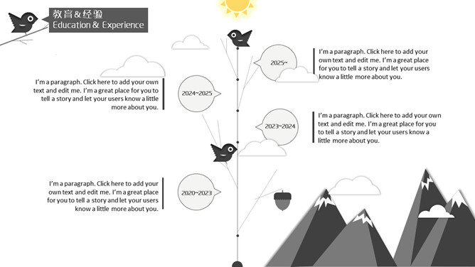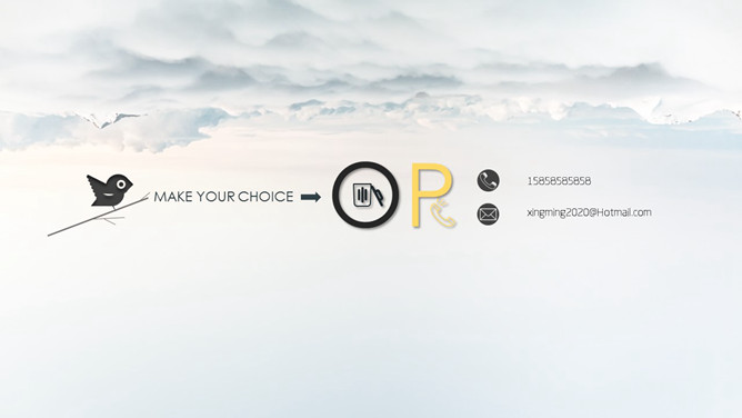 高逼格个人简历幻灯片模板。壮阔云海背景图片,站在树枝上的小鸟设计,象征着良禽择木而栖,微立体风格。建议安装字体: