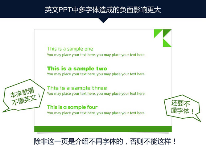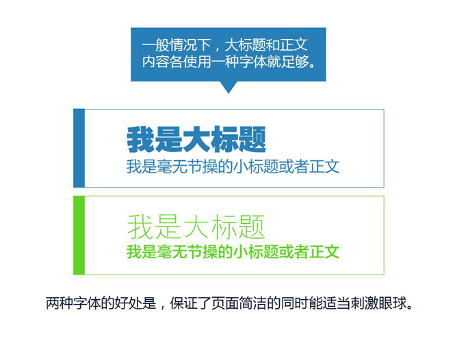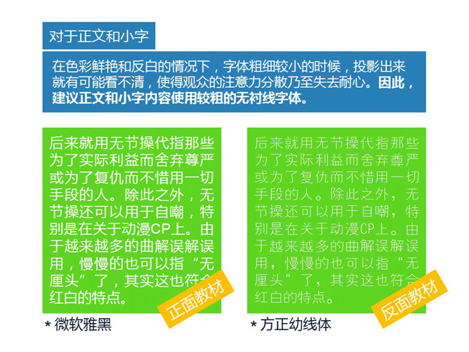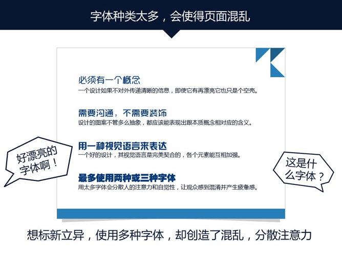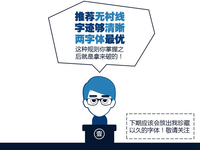 嘉文钱扁平化PPT教程字体篇上。扁平化风格使用字体的三句箴言:推荐无衬线,字迹够清晰,两字体最优。无衬线字体能快速传递信息,去掉不必要的装饰。鲜艳多彩色和反白处理,确保字体笔画清晰度。粗的字体会粗犷霸气,透露出力量感,细字体精致细腻,让内容更有气质。简洁是扁平化的设计特征,要控制字体数量。