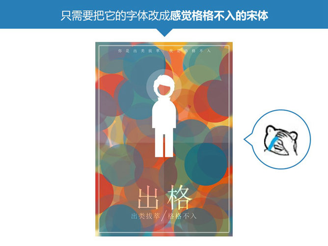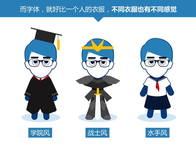 嘉文钱扁平化PPT教程字体篇下。对于PPT来说,文字内容就好比一个人赤裸的肉体,字体就好比一个人的衣服,不同的衣服会有不同的感觉。宋体、楷体、隶书等快餐式字体会毁页面,掉档次。不同的字体能让页面表现出不一样的气质。用字体表现正确感觉和气质是一种能力。