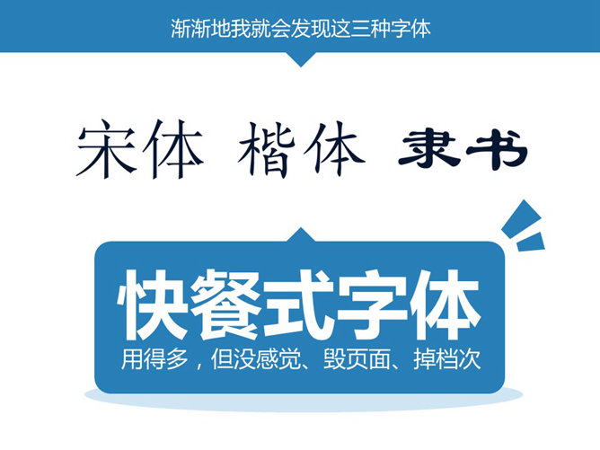 嘉文钱扁平化PPT教程字体篇下。对于PPT来说,文字内容就好比一个人赤裸的肉体,字体就好比一个人的衣服,不同的衣服会有不同的感觉。宋体、楷体、隶书等快餐式字体会毁页面,掉档次。不同的字体能让页面表现出不一样的气质。用字体表现正确感觉和气质是一种能力。