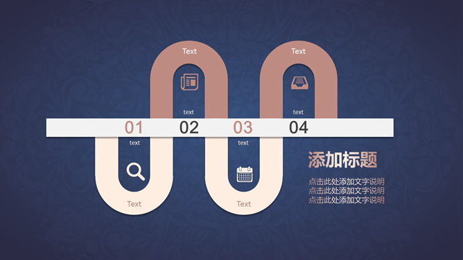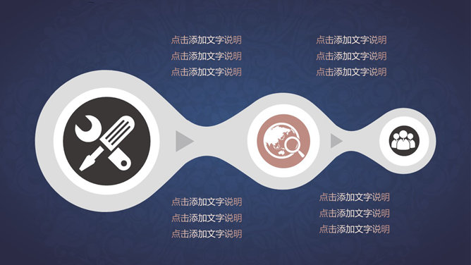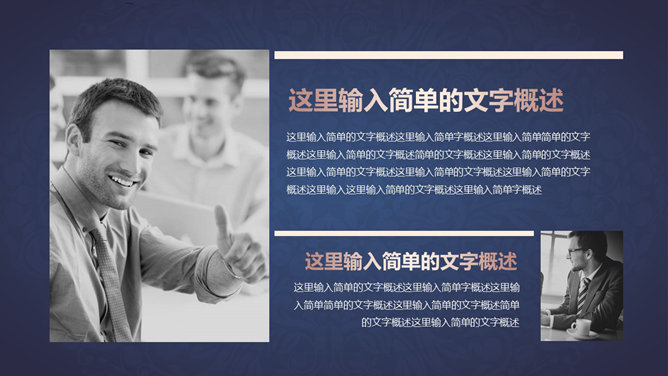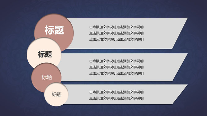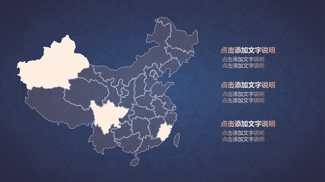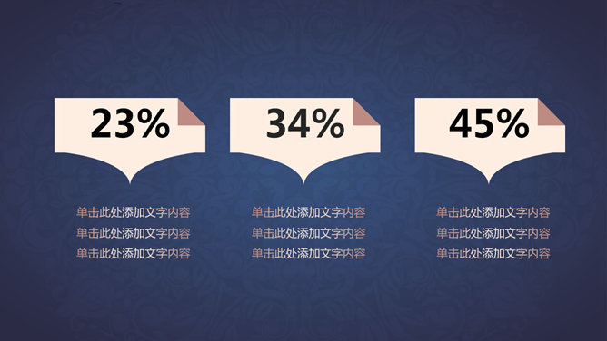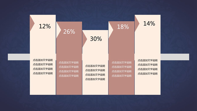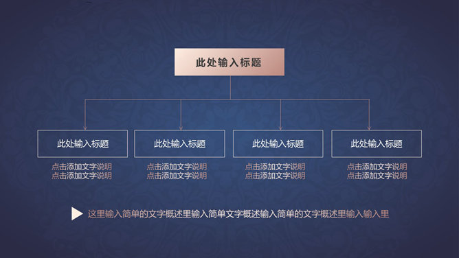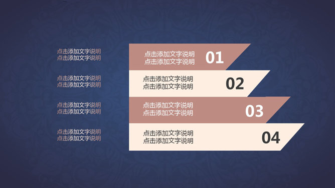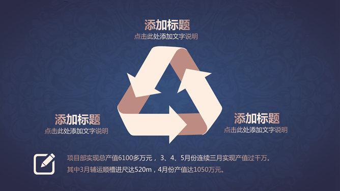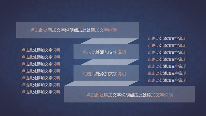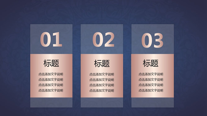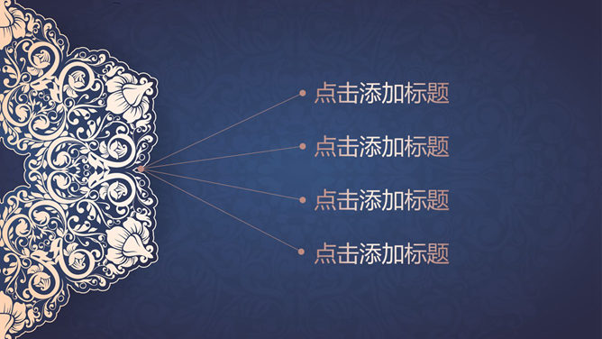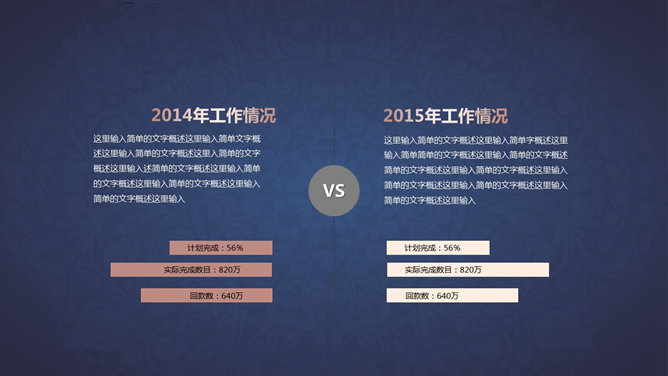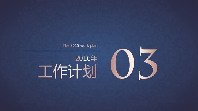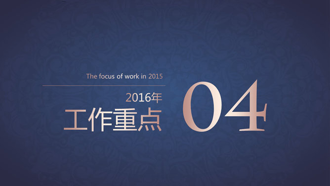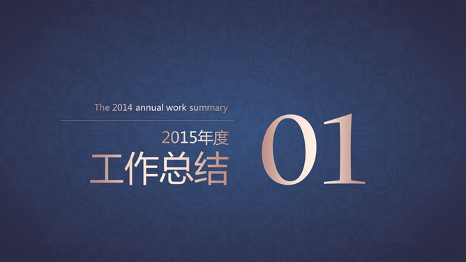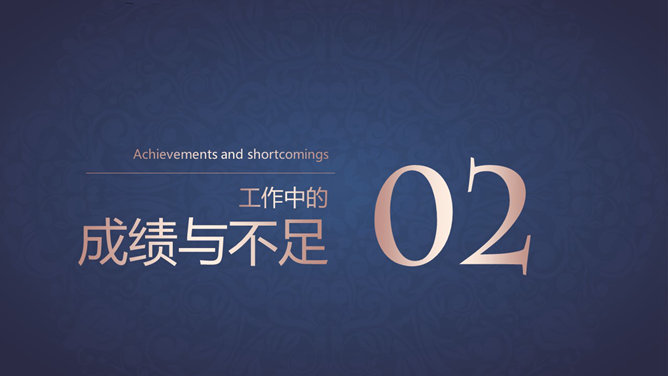 一份工作总结计划PPT模板,蓝色花纹纹理背景,烫金效果花纹及形状装饰,华贵大气,淡入淡出切换,包括工作总结、成绩和不足、工作计划和工作重点几个部分,图形图表页面丰富。