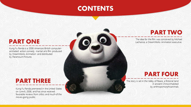 一份精美的动画电影《功夫熊猫3》主题PPT模板。《功夫熊猫3》是《功夫熊猫》系列的第三部电影,由余仁英执导,杰克·布莱克、凯特·哈德森、布莱恩·科兰斯顿原版配音主演,黄磊、杨幂、成龙、周杰伦、朱珠担任中文版配音,该片将于2016年1月29日在中国和北美地区首映。