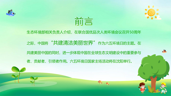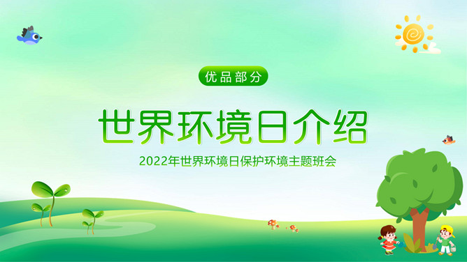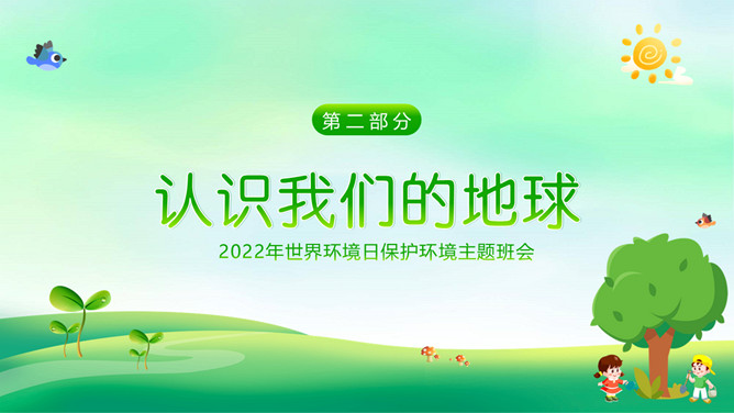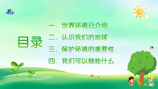 世界环境日保护环境PPT模板。一套世界环境日主题模板,大树、幼苗、草地、小鸟和正在植树的可爱孩子背景。