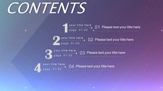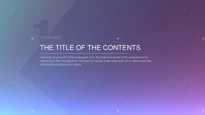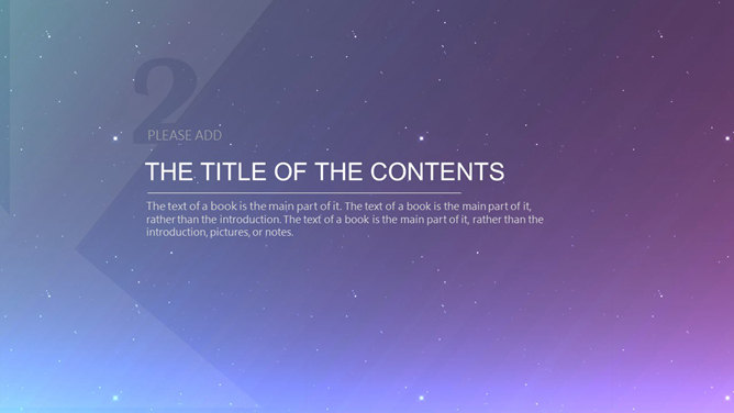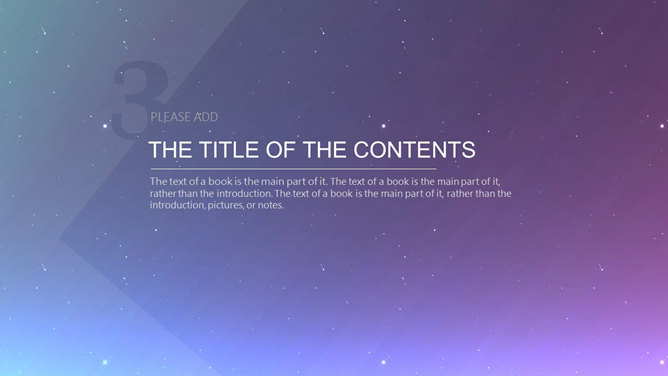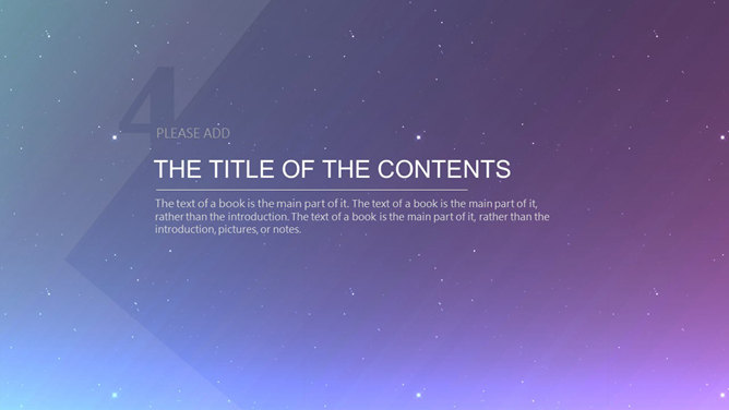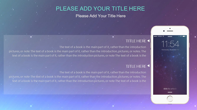 星空科技IOS风动态PPT模板。科技感星点紫色渐变苹果风格背景,半透明形状及文本框,时尚高逼格,炫酷的动态演示效果。所用字体较多,请另行下载安装。