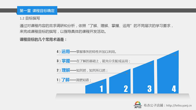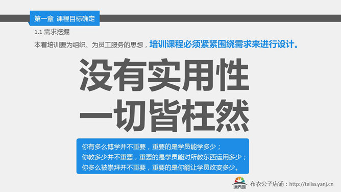内训师课程开发培训PPT课件。布衣公子作品:课程开发实务。课程目标:1)了解 —— 课程开发的两种类型;2)理解 —— 课程开发的实施过程;3)掌握 —— 课程开发的各环节具体方法;4)运用 —— 结合本课的学习,进行专题课程开发,并进行分享。
