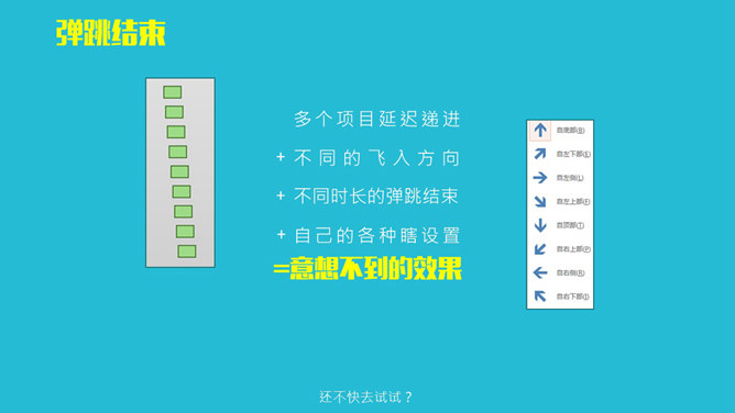 详细的PPT飞入动画使用教程。详细的介绍了飞入动画的各类视觉效果和如何使用,并举了一些例子,很有实用价值。