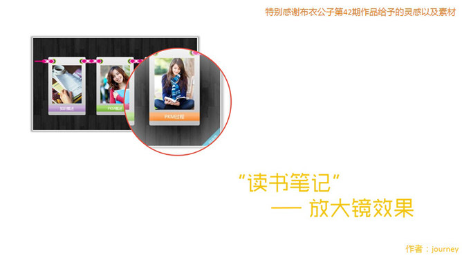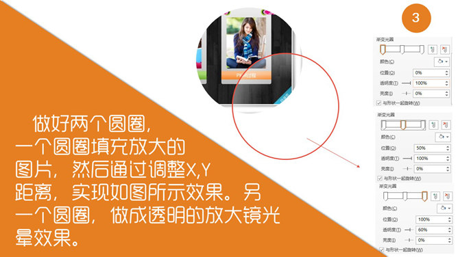 制作图片放大镜效果PPT教程。准备好一张图片,把图片放大到你觉得合适的大小,注意放大的时候用Shift,做好两个圆圈,一个圆圈填充放大的图片,通过调整X,Y距离,实现如图所示的效果,另一个圆圈,做成透明的放大镜光晕效果。