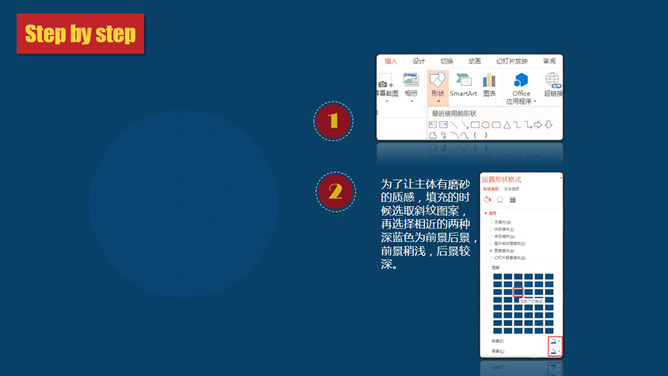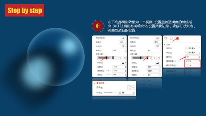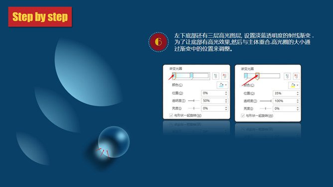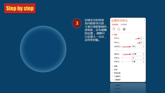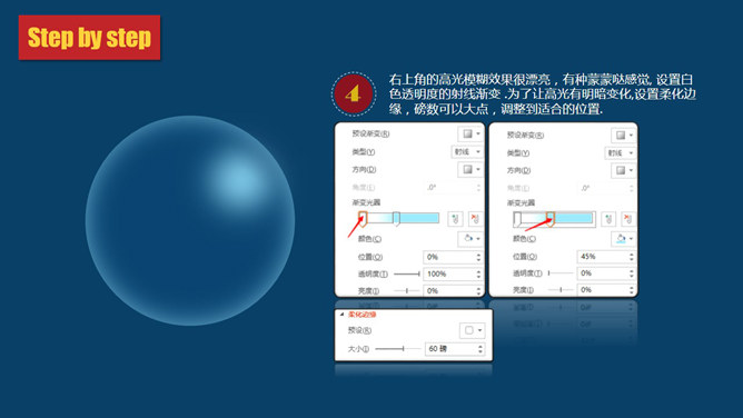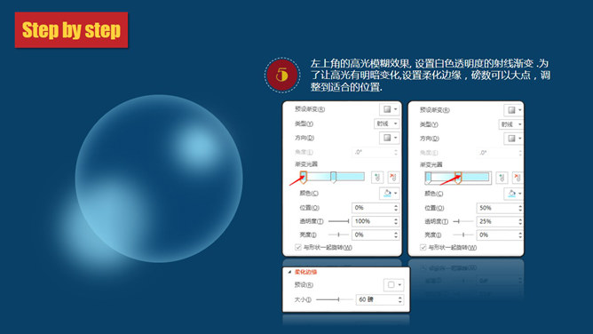 绘制质感透明玻璃球PPT教程。为了让主体有磨砂的质感,填充的时候选取斜纹图案,再选择相近的两种深蓝色为前景后景,前景稍浅,后景较深。边缘发光的效果用内阴影来代替,主要注意阴影颜色,透明度,还有模糊的设置 。模糊可以设置大一点点,这样更舒服。右上角的高光模糊效果很漂亮,有种蒙蒙哒感觉, 设置白色透明度的射线渐变 .为了让高光有明暗变化,设置柔化边缘,磅数可以大点,调整到适合的位置……