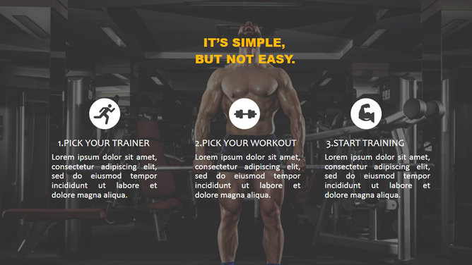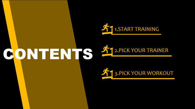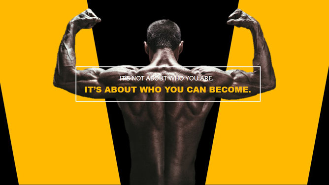 一份运动塑身健身减肥主题PPT模板,时尚杂志设计风格,经典黑黄配色,健身健美图片背景,动态演示效果。