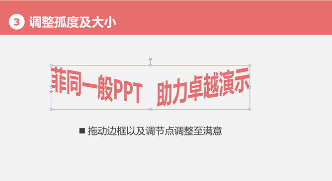PPT文字转换之弯曲效果。大猫菲菲19号教程:文字转换之弯曲。步骤:1、选中文本框,格式-文本效果-转换。2、转换-弯曲。共36个效果。3、调整弧度及大小。拖动边框以及调节点调整至满意。