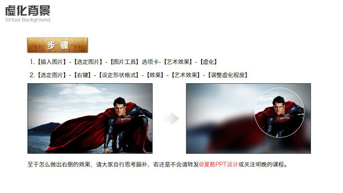 图片虚化效果制作PPT教程。步骤:1.【插入图片】-【选定图片】-【图片工具】选项卡-【艺术效果】-【虚化】。2.【选定图片】-【右键】-【设定形状格式】-【效果】-【艺术效果】-【调整虚化程度】。