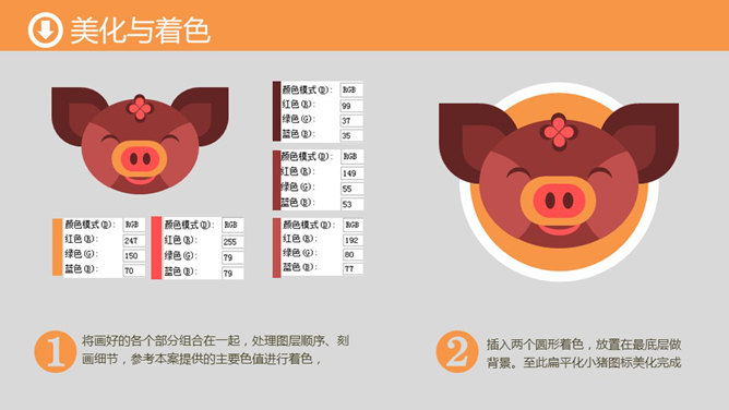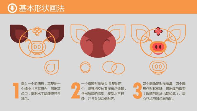 手绘动物PPT教程(猪)。基本形状画法:1、插入一个泪滴形,再复制一个缩小并与其组合,画出耳朵形,复制水平翻转作另只耳朵。2、一个椭圆形作猪头,并复制两个,调整相交位置作布尔运算,得出脸颊的造型,复制水平翻转,并与头型两侧对齐。3、两个圆角矩形作猪鼻,两个圆形作形状剪除,得出嘴的造型(眼睛的画法也是如此)。眉心花纹与耳朵画法同。
