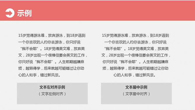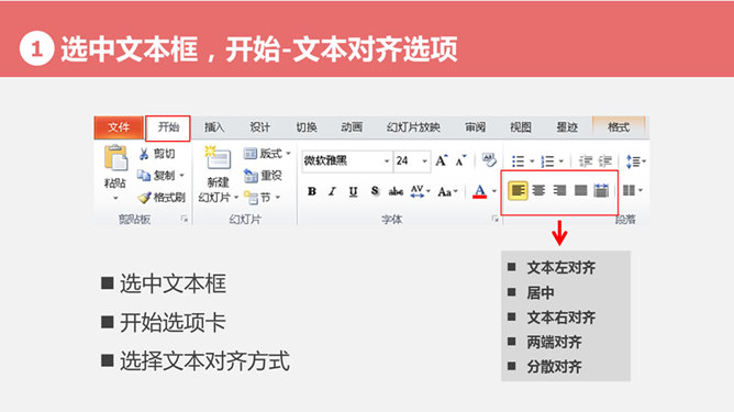 PPT文本对齐详解。大猫菲菲20号教程:文本对齐。选中文本框,开始选项卡,选择文本对齐方式,共5种对齐方式,文本左对齐、居中、文本右对齐、两端对齐、分散对齐。