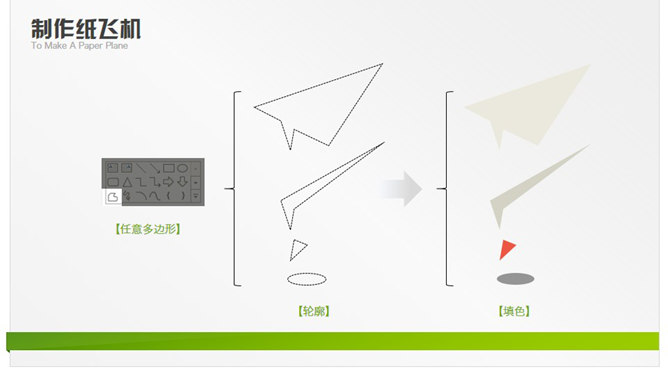 PPT手绘纸飞机教程。用任意多边形工具按照如图所示绘制组件,然后填色,最后组件组合。