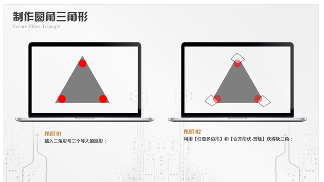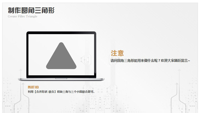 PPT制作圆角三角形技巧。步骤:1、插入三角形和三个等大的圆形;2、利用【任意多边形】和【合并形状-剪除】获得缺三角;3、利用【合并形状-联合】将缺三角与三个小圆联合即可。