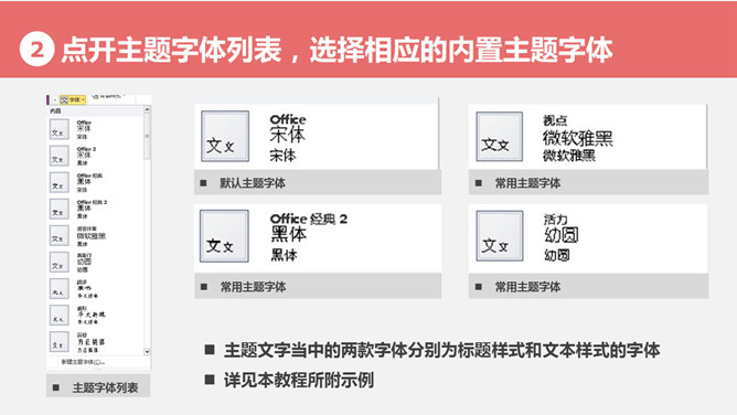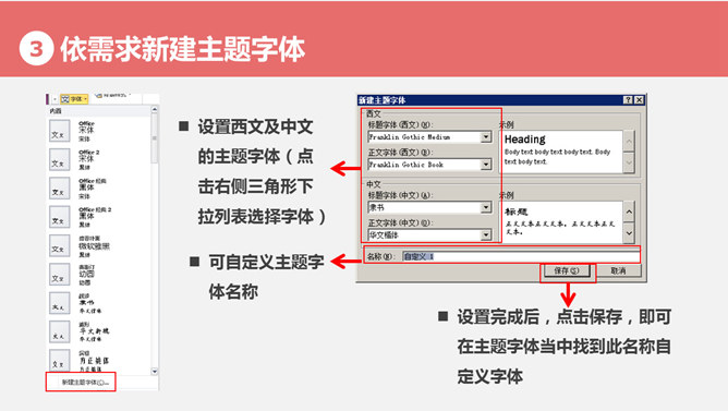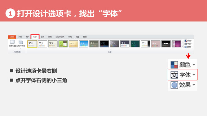 PPT主题字体设置步骤。步骤:1、设计选项卡最右侧,点开字体右侧的小三角。2、点开主题字体列表,选择相应的内置主题字体。3、按需求新建主题字体。