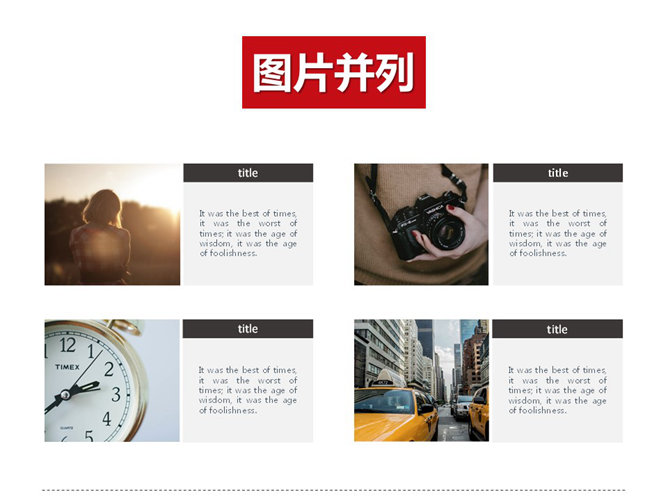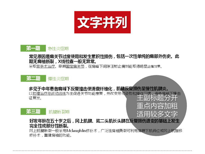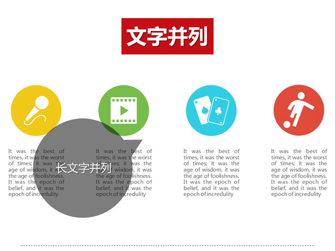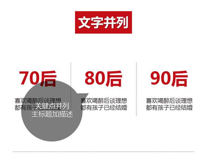 PPT排版逻辑关系心得(上)。你是否遇到过这种情况,老板:小李,帮我做个PPT。满心欢喜拿到文案,打开一看,尼玛,几千的文字。老板虐我千百遍,我待老板如初恋。首先就是要整理大段文字、大把图的逻辑关系。先说第一种:并列关系,包括文字并列、图片并列、图形并列,并列状态只有前后之分而无主次之分。